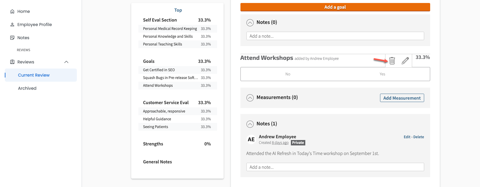 Note: Only an Employee or their Manager can remove goals. Administrators cannot perform this function on from their Administrator View.