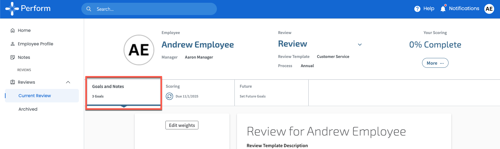 If your current Review is in Scoring mode, click the Goals and Notes tab in the Review Hub.