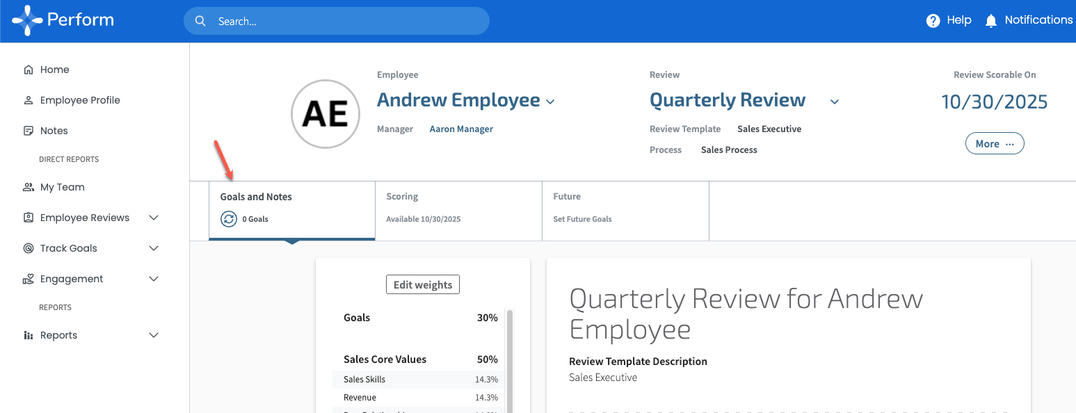 If your employee’s Review is in Scoring mode, click the Goals and Notes tab in the Review Hub.