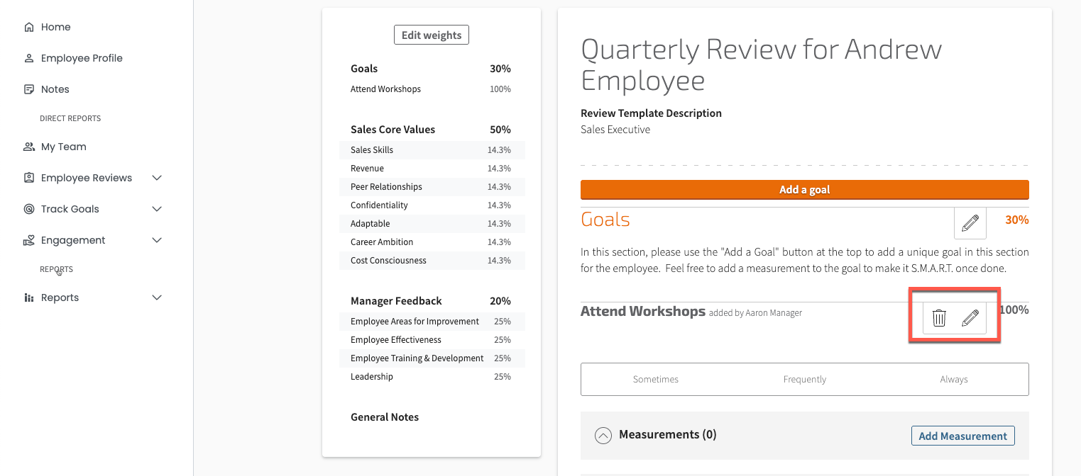 Note: Only an employee or their manager can remove goals. Those in the Administrator's view cannot perform this function.