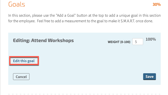 Only the user who originally added the goal will be able to edit that goal. For example, if the employee's manager originally added a goal to the employee's review, that manager will be the only one who can make changes to the goal (ie, edit the rating scale, description, goal name, etc).