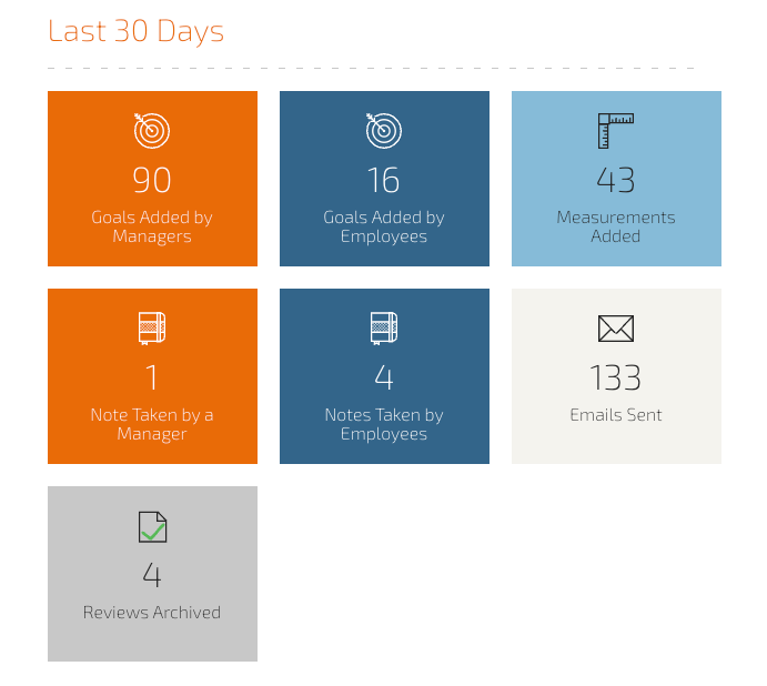 The Administrator Dashboard has an at-a-glance overview of various tasks, to-dos, and details in your Trakstar Perform account. The look of your dashboard may be slightly different than this view, depending on your account setup.