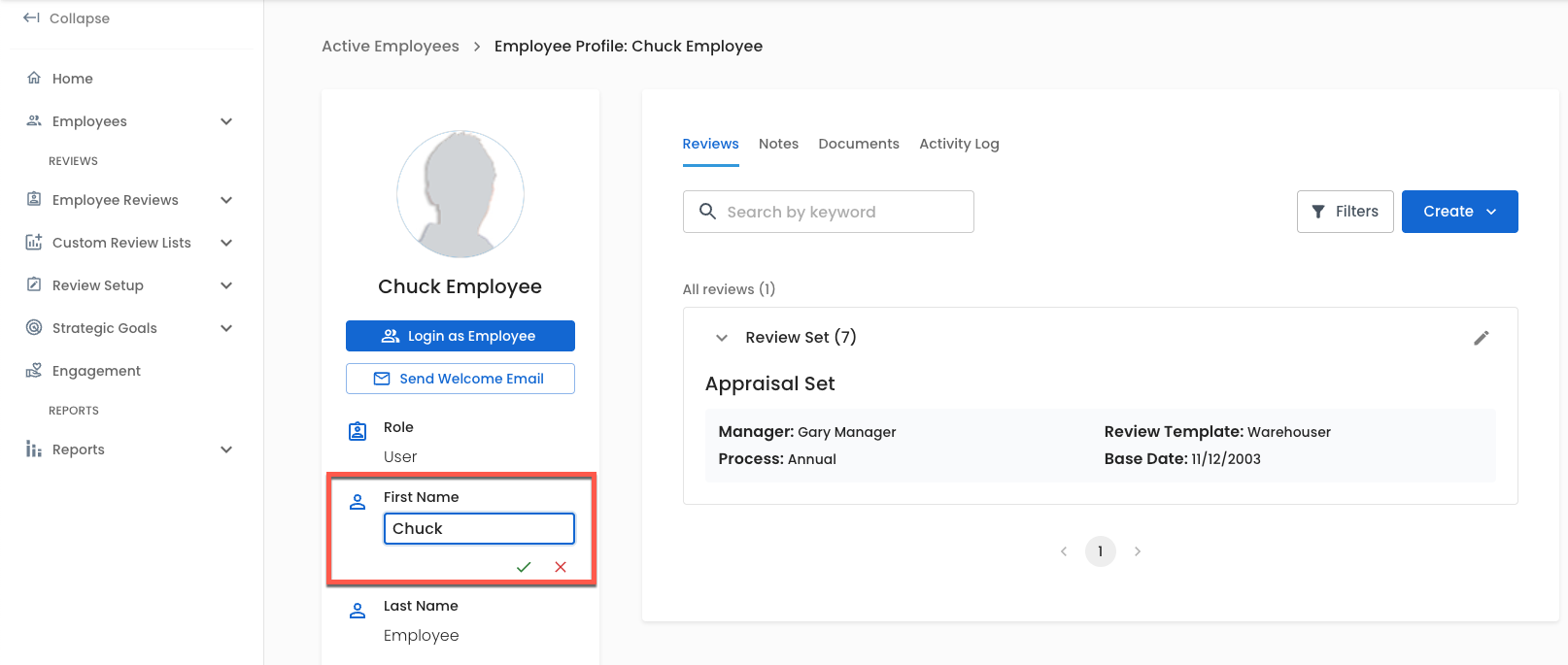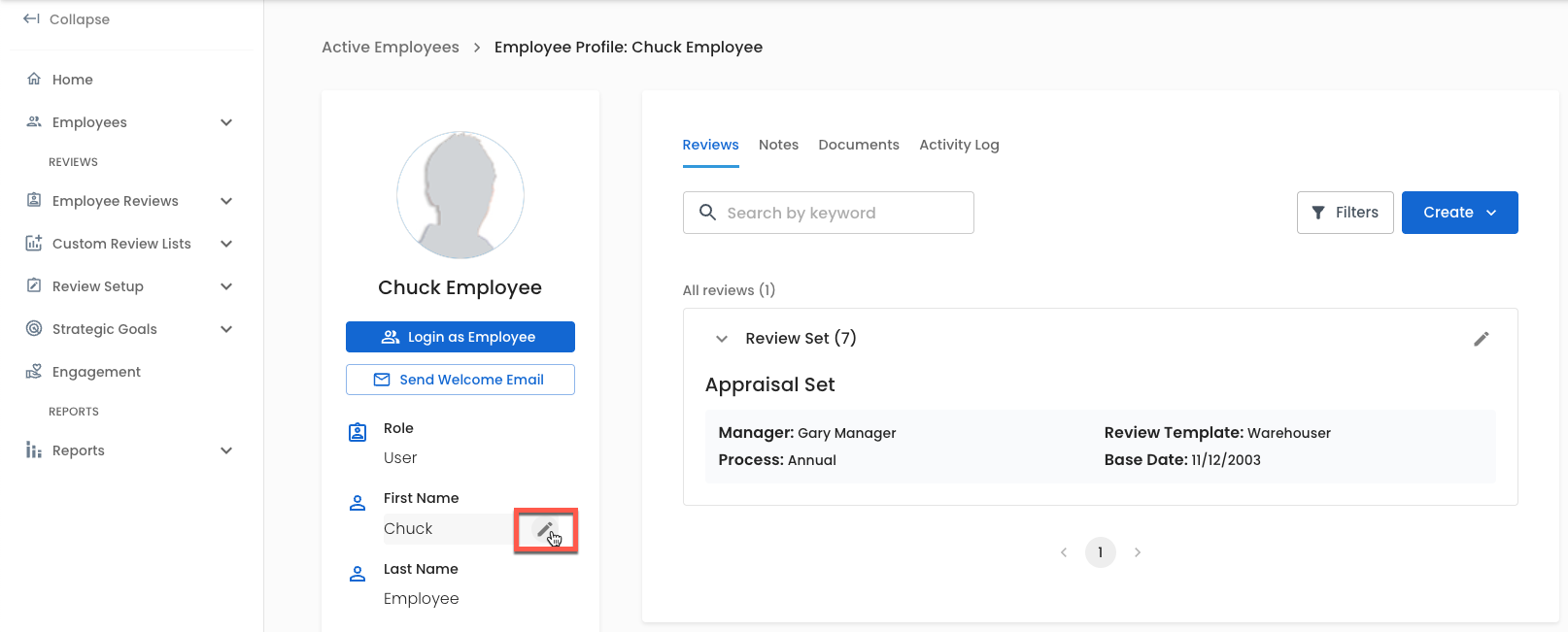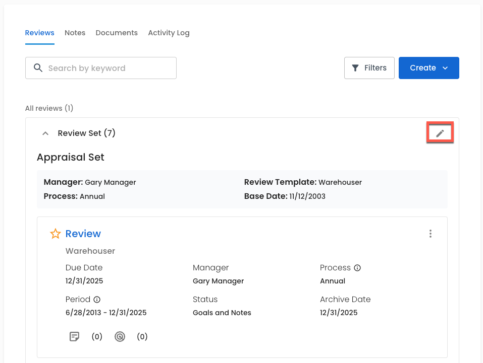 Editing a Review Set allows you to update an employee's manager, review template, base date, and process.