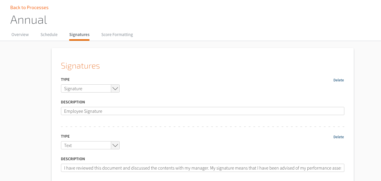 Signatures allow space for a signature on the hard copy of the review. This is often used when a manager will print out the review and have the employee sign it. If you plan to keep your review process online, you may want to set up additional approval routes to include an employee acknowledgment and remove all the signature lines on this page.