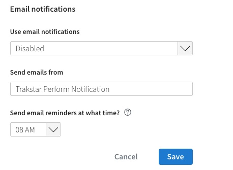 This setting allows you to enable and disable notifications for your entire account. This controls whether Perform can send emails to your users. The only email that will go out when this is disabled is the Welcome Email for new users with their login information.