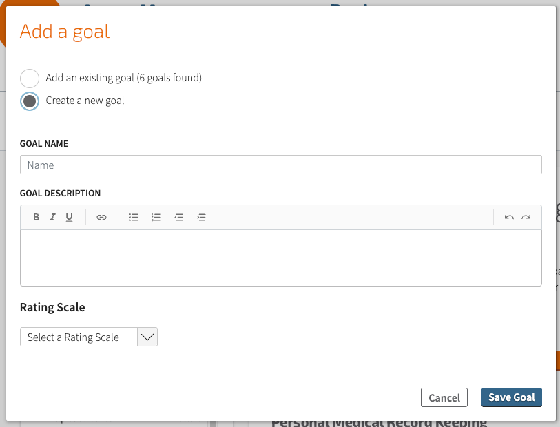 Add the Goal Name and a description, select the appropriate rating scale, and remember to Save the Goal when you are done.