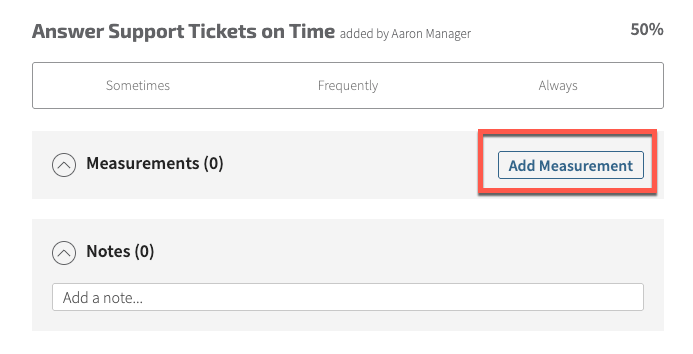 Locate where you want to add your measurement - they can be added to a competency or goal. Once you find the location, click on Add Measurement.