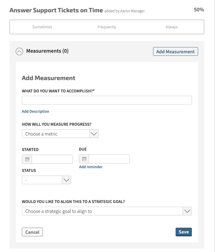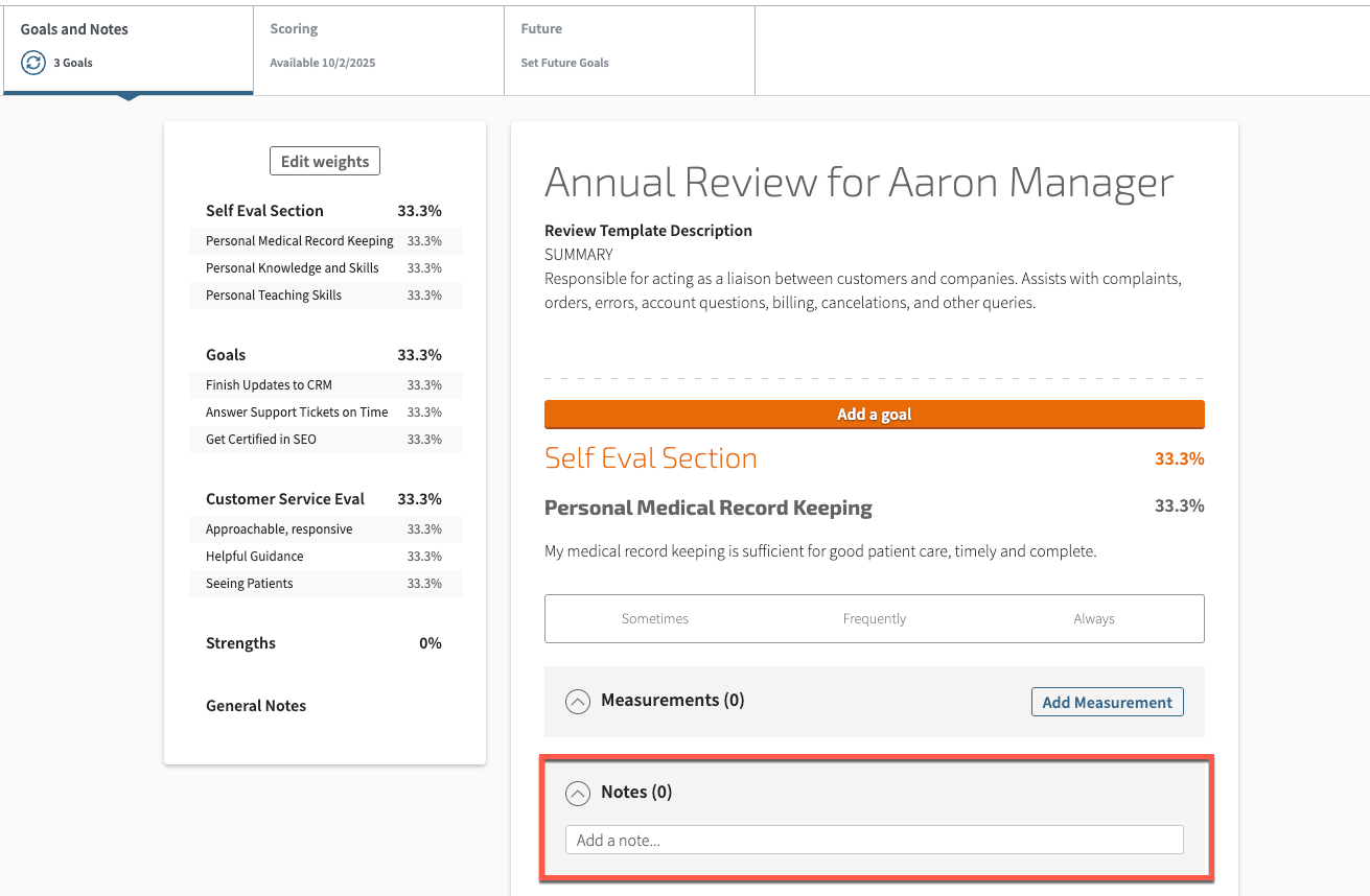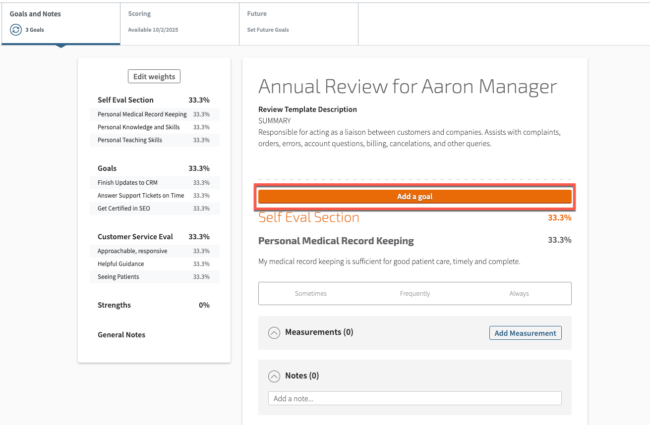 Pro Tip: If Goal Setting is enabled, you will see the Add a Goal button. Managers may have the ability to set goals, too! If you cannot add a goal, you can add a measurement attached to a competency. Goals are big-picture competencies that are set for an individual to focus on. Goals are scored and can carry weight overall.