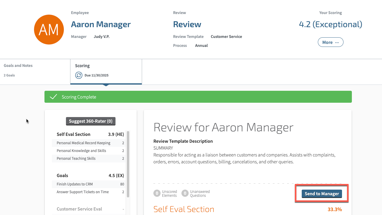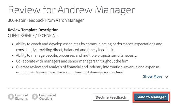 When everything has been scored, you can click Send to Manager to complete your 360-Rater Feedback.