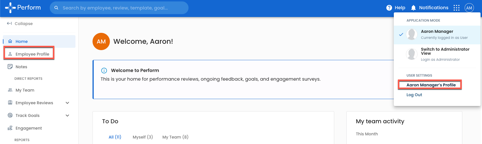 Click on your initials in the top right corner of your account, and select Profile Settings from the drop-down menu, or select Employee Profile from your navigation bar.