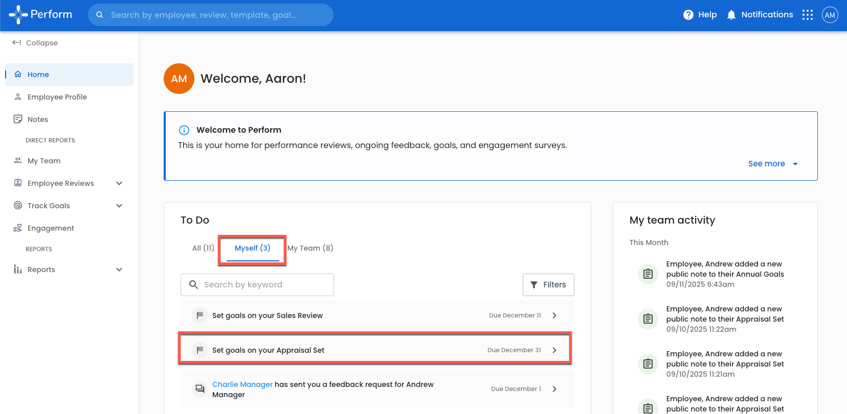 If your review is in scoring, this button will say Score Review. Once you are inside your review hub, you can click on Goals and Notes in the timeline to add a goal.