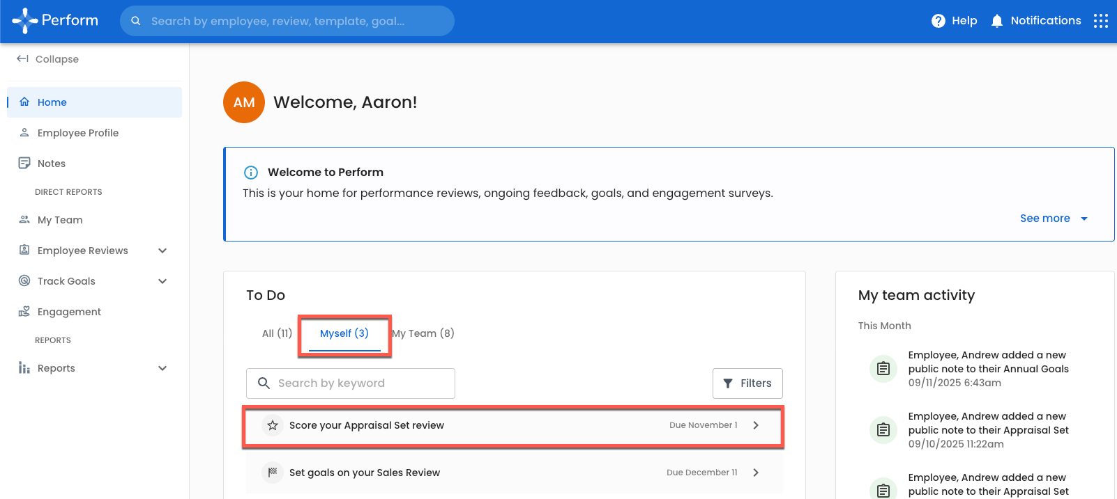 When it's time to score your self-review, your current review button will change from Set Goals to Score Review. Click on Score Review to get started.