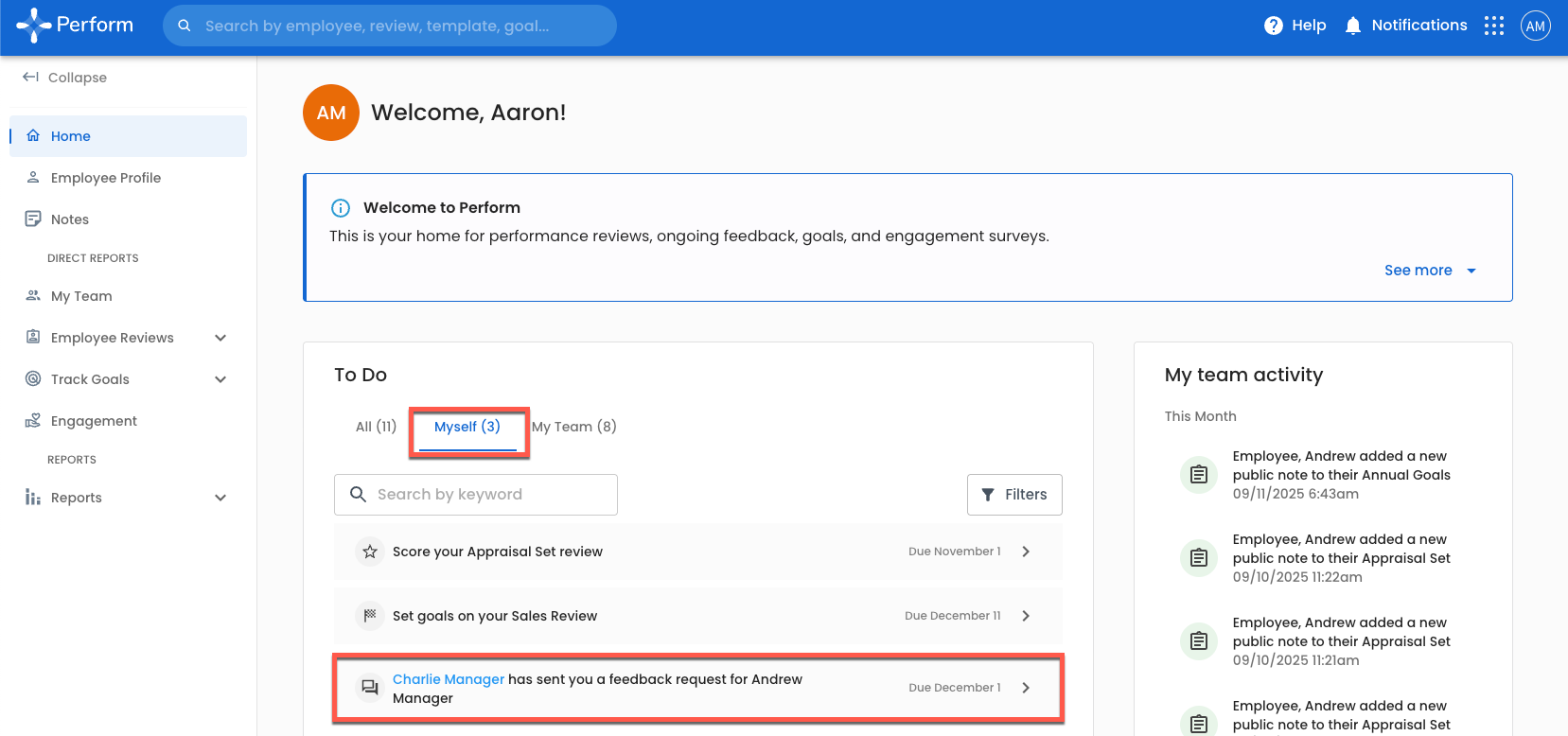 Your colleagues may request that you offer feedback on their review. If selected, you will receive an email, and the request will appear on your homepage under Myself.