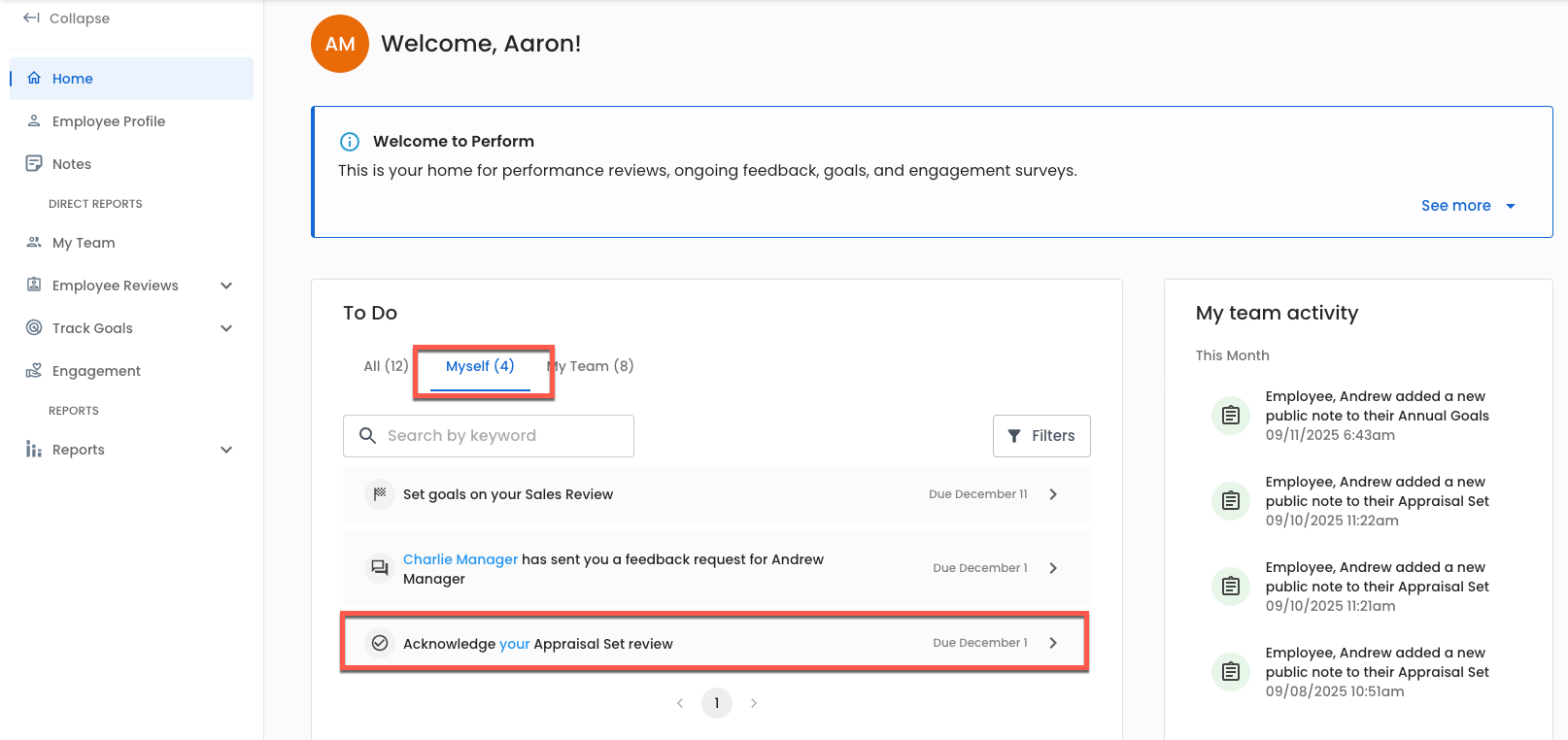 Once your review has been completed and you've met with your manager, your manager will send your review for Approval. Although not all companies have this setup, you will need to acknowledge your review if your company has enabled it!