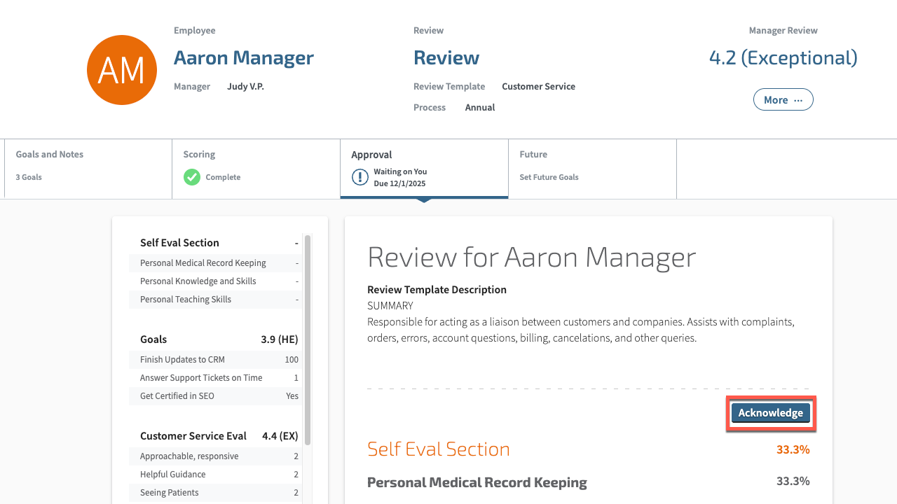 Once selected, you will notice an Approval tab within your review. Click into this tab, and you will be able to review your manager's scores and feedback. When you're finished, select the Acknowledge button.