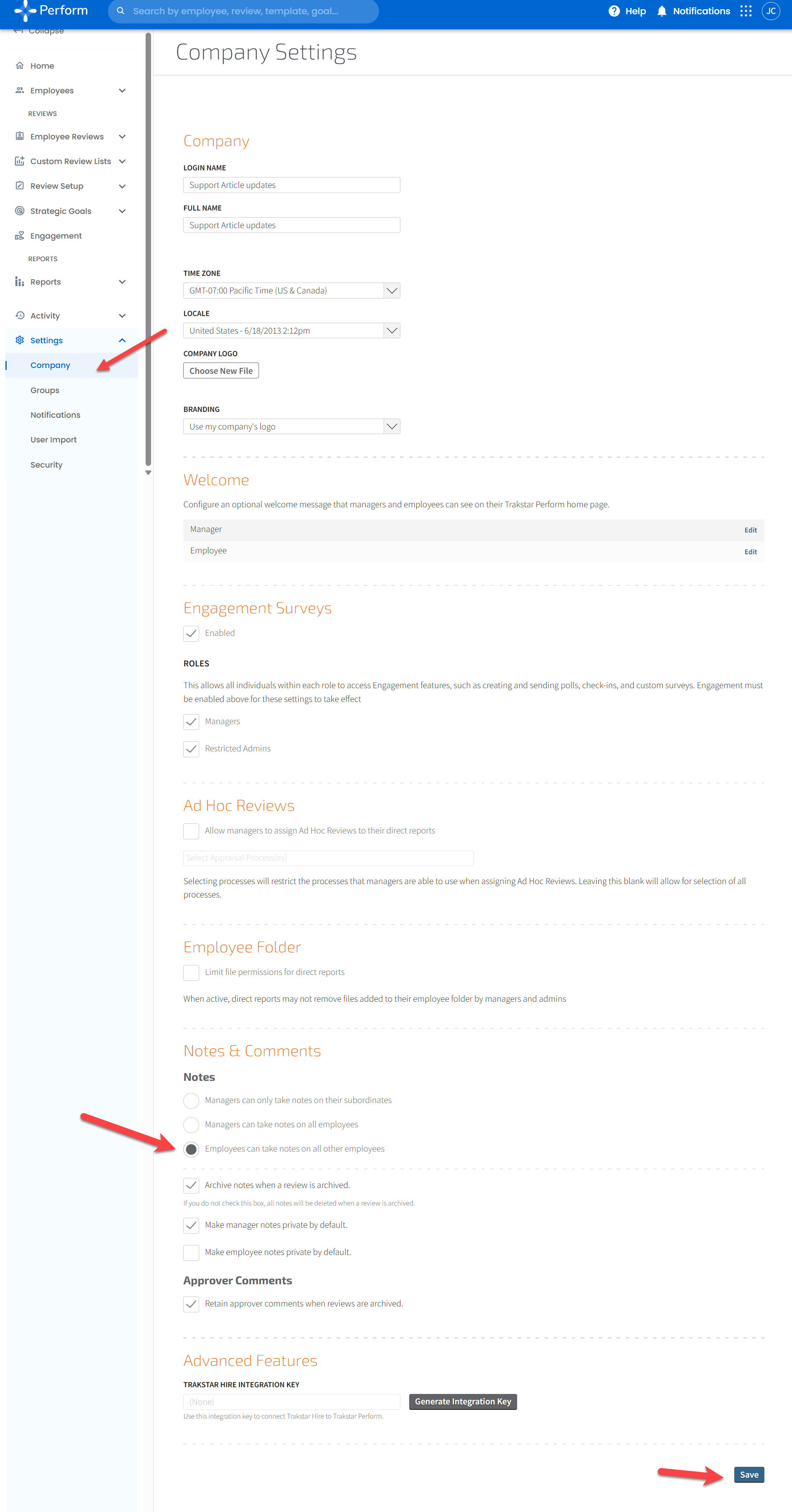 To get started, navigate to Settings > Company > Notes & Comments. Select the option Employees can take notes on all other employees, then click Save.