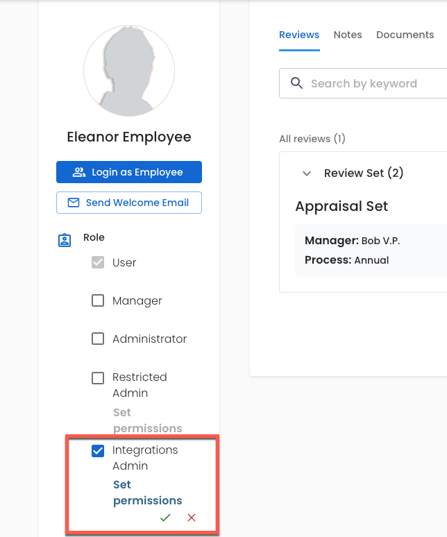 - This can be turned on via their User Profile under the Roles section. You can select which integrations an Integrations Admin will have permission to access here as well - click Permissions next to the Integrations Admin check box.