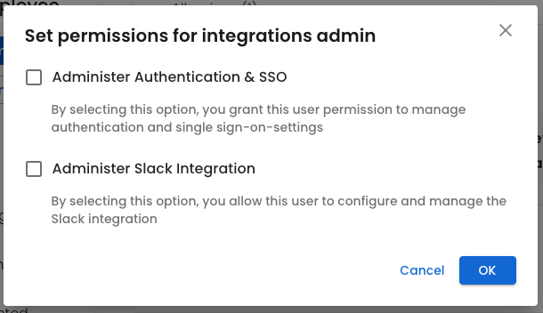 - Grants a user permission to set up specific integrations within the system (such as Slack or SSO) without allowing them any additional permissions in the system