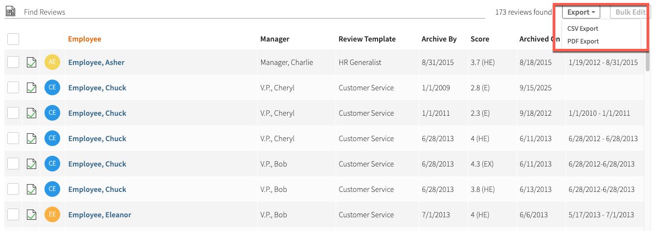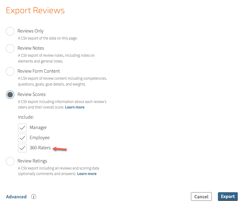 If your company utilizes 360-Rater Feedback and you need to report on each rater's individual scores, say no more! With the An Export to CSV option is provided in your review lists. There is a selection you can make to ensure these exact details are part of the report!