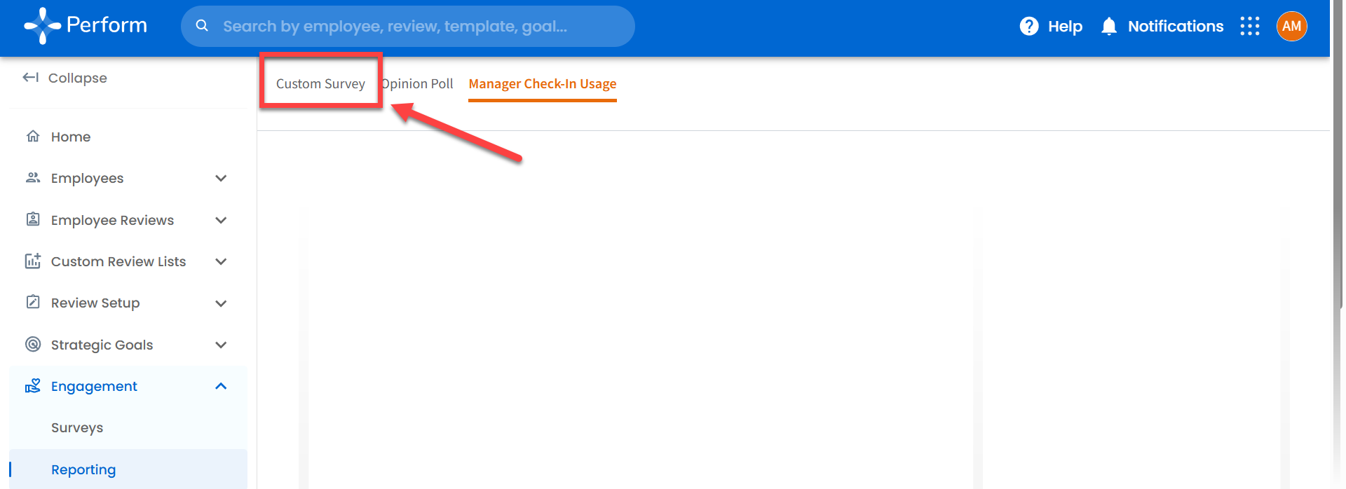 The Administrator of your Perform account might have disabled Engagement for Managers. If you do not see Engagement in the left-hand Panel, please reach out to your Administrator (often HR) to enable it.
