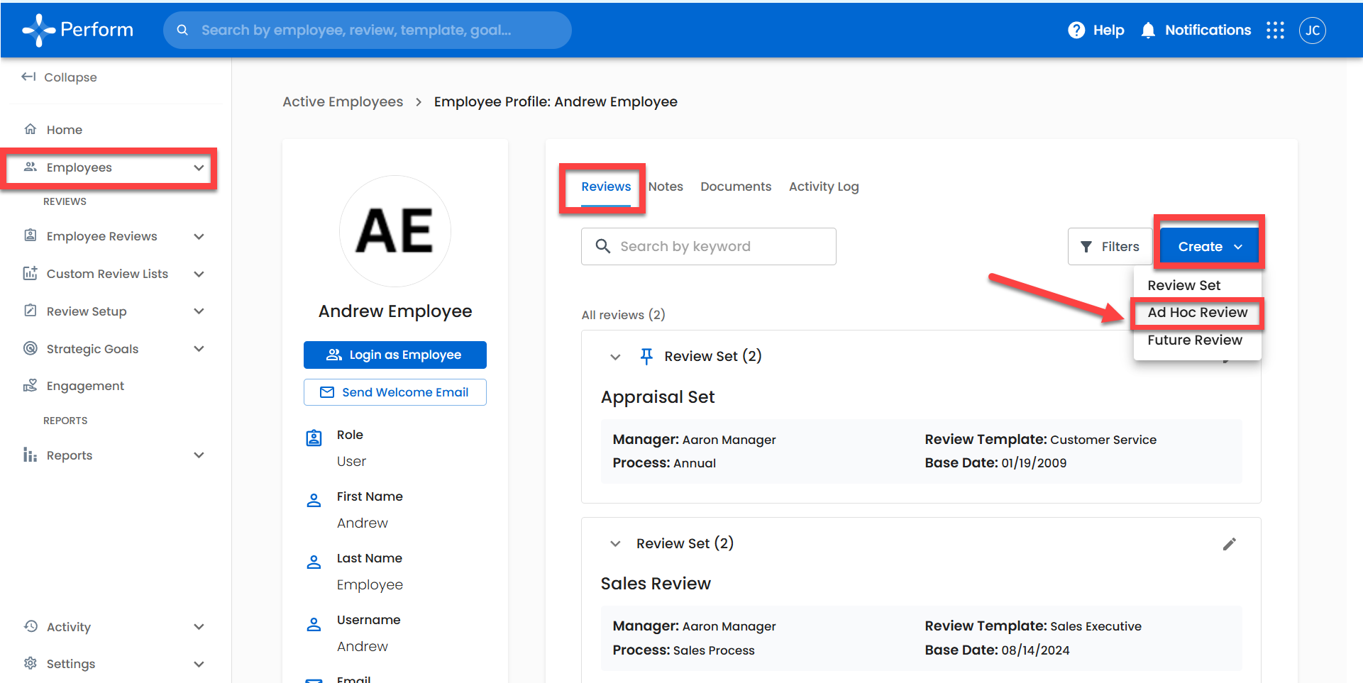 By following these steps, you can effectively create and manage Ad Hoc reviews, ensuring that specific performance assessments are conducted as needed.