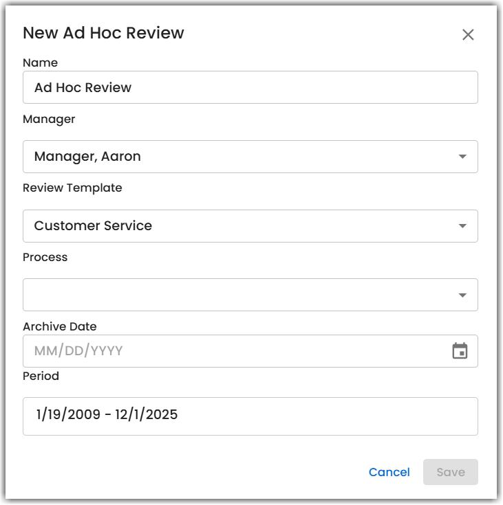 - Archived ad-hoc reviews remain accessible for future reference by administrators, managers, and the employee.